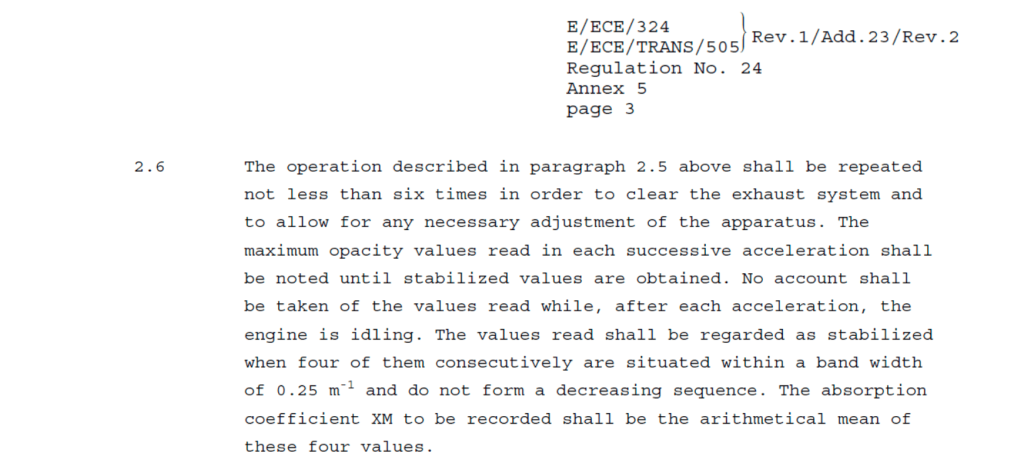 While certain Opacimeter brands follow China’s test standard, in contrast, Test Procedure Standard in the Annex-C of the IRR of Philippine Clean Air Act is based on UN Regulation 24 Rev.1/Add.23/Rev.2, paragraph 2.6 of Annex 5, page 3: